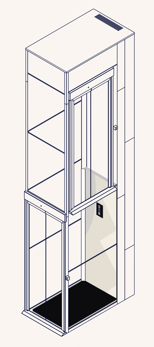 A compact lift for houses. Installation on the floor or in 50mm pit. Built in machineroom, 2300 mm headroom. Home lift sizes >>